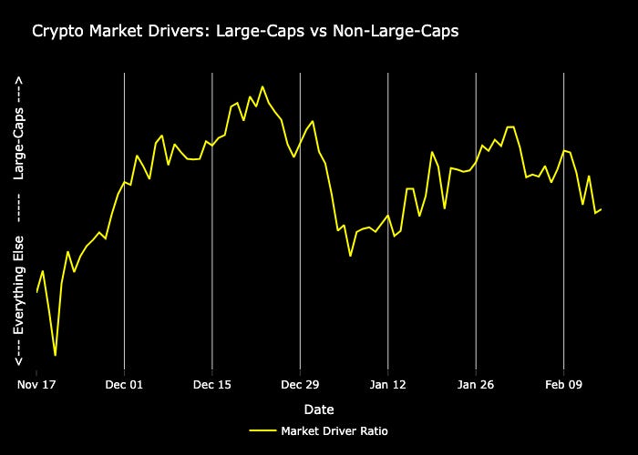 The Market Driver Ratio measures relative performance concentration among the top 100 cryptocurrencies by comparing market-cap-weighted performance with equally weighted performance.